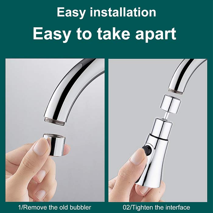 Pentru a instala un nou cap de robinet, pur și simplu îl deșurubați pe cel vechi și atașați înlocuitorul. Comutarea între jeturi este, de asemenea, ușoară prin apăsarea unui buton de pe capul robinetului.
