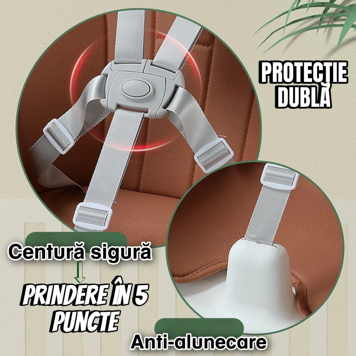 ✔ Centură de siguranță în 5 puncte – Asigură o fixare fermă și protejează copilul în timpul mesei.