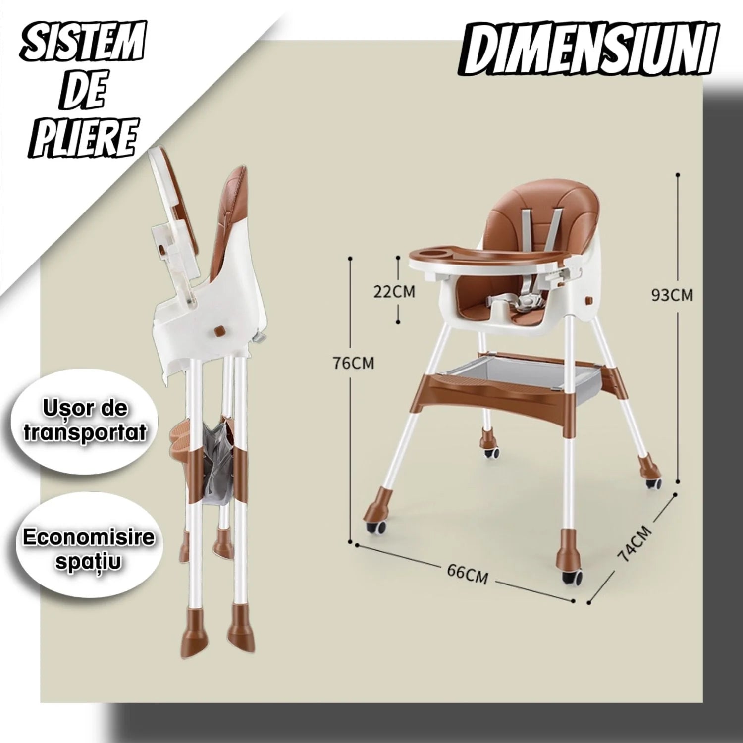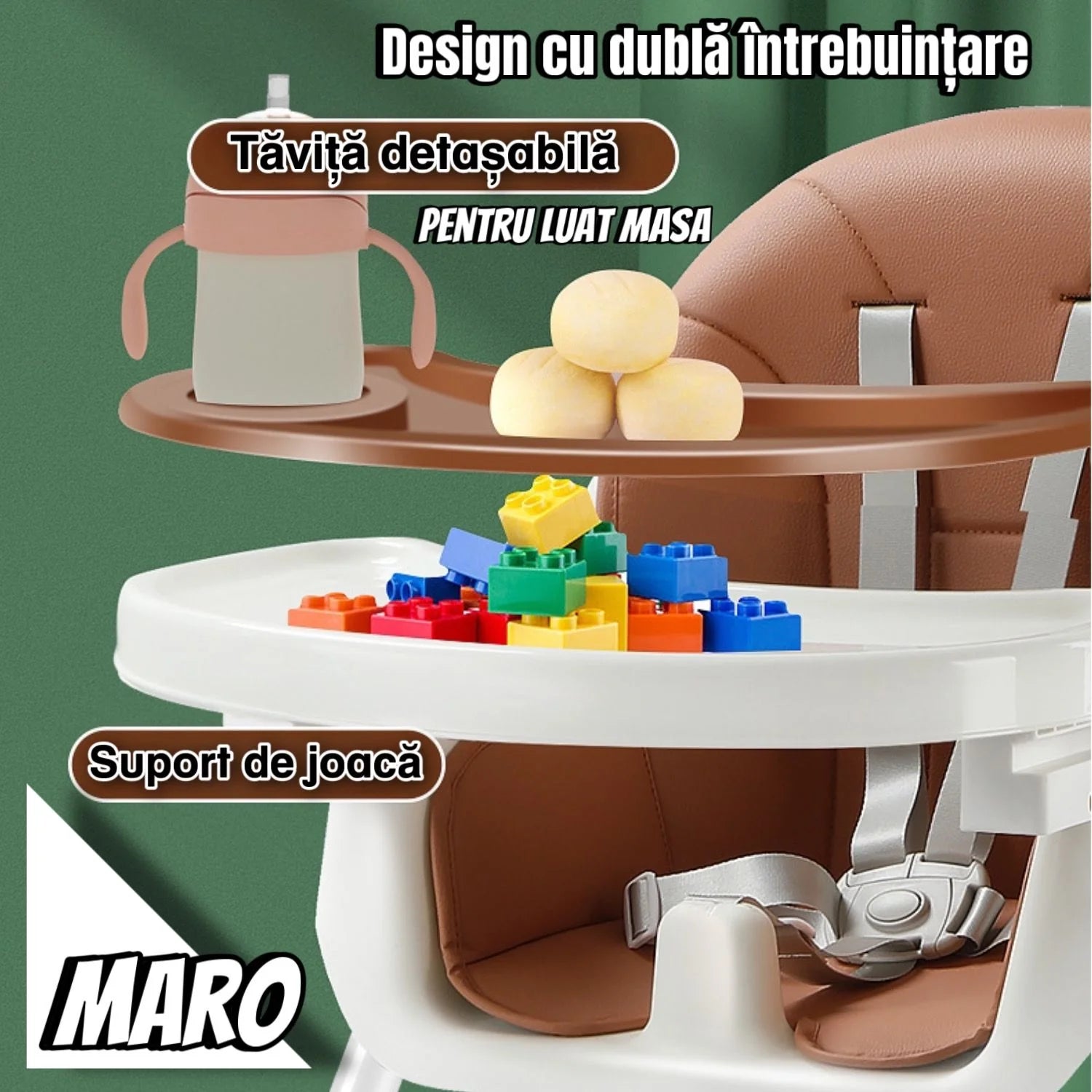 ✔ Tăviță reglabilă și detașabilă – Se poate ajusta în funcție de nevoile copilului și este ușor de curățat.
