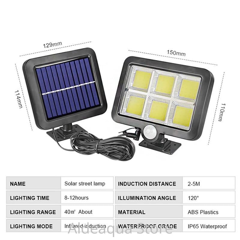 Lampa solara de perete are 6 Led-uri Mari COB de mare putere oferind o dispersie buna a luminii pe timp de noapte.. Aceasta se incarca in 8h (numai daca lumina soarelui bate direct in panoul solar) si la o incarcare complete a acumulatorului lumineaza pentru 2 nopti in modul economic (iluminare 10% din putere).
