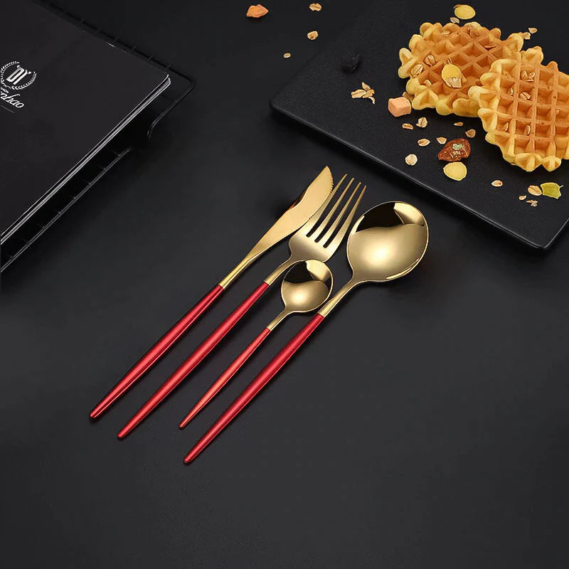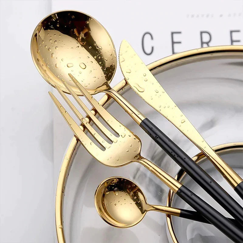 Mânerele prezintă un design subțire și conic, având o nuanță de verde smarald care creează un contrast plăcut cu nuanța reflectorizantă a capetelor, un auriu lucios ce conferă meselor o aură sofisticată și prețioasă.Fabricat din oțel inoxidabil de înaltă calitate, acest set elegant de tacâmuri din 24 de piese se remarcă prin netezimea sa, rezistența la coroziune, zgârieturi și uzură frecventă.